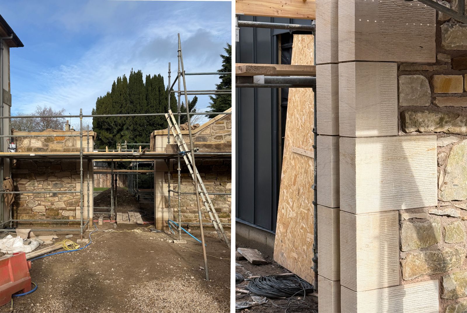 Great to see the masonry detailing coming together at our East Lothian extension, referencing exisitng rubble walls around the B-listed property. The fine droving and horizontal broaching at the rybats recreates the detailing elsewhere on site.